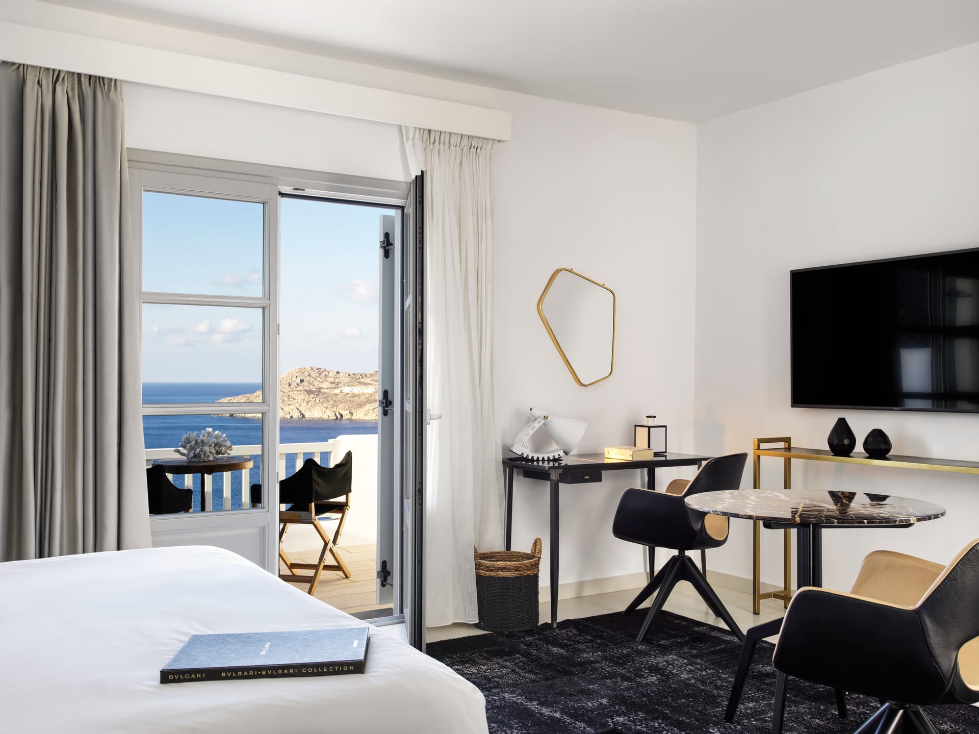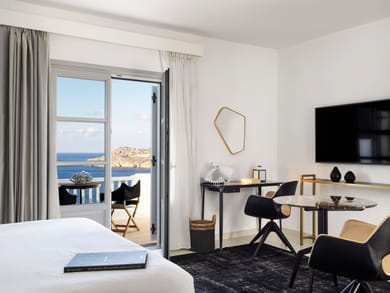 Comfortably sized and stylishly decorated, our Prestige Guestrooms with Private Pool, situated in upper floors, offer the luxury conveniences and high quality services of a 5 star luxury resort provided by our experienced and welcoming staff. Featuring a private seawater infinity pool and a sunbathing terrace with panoramic views of the Aegean Sea and pristine Elia Beach, these prestige accommodations showcase Mykonos hospitality at its best.