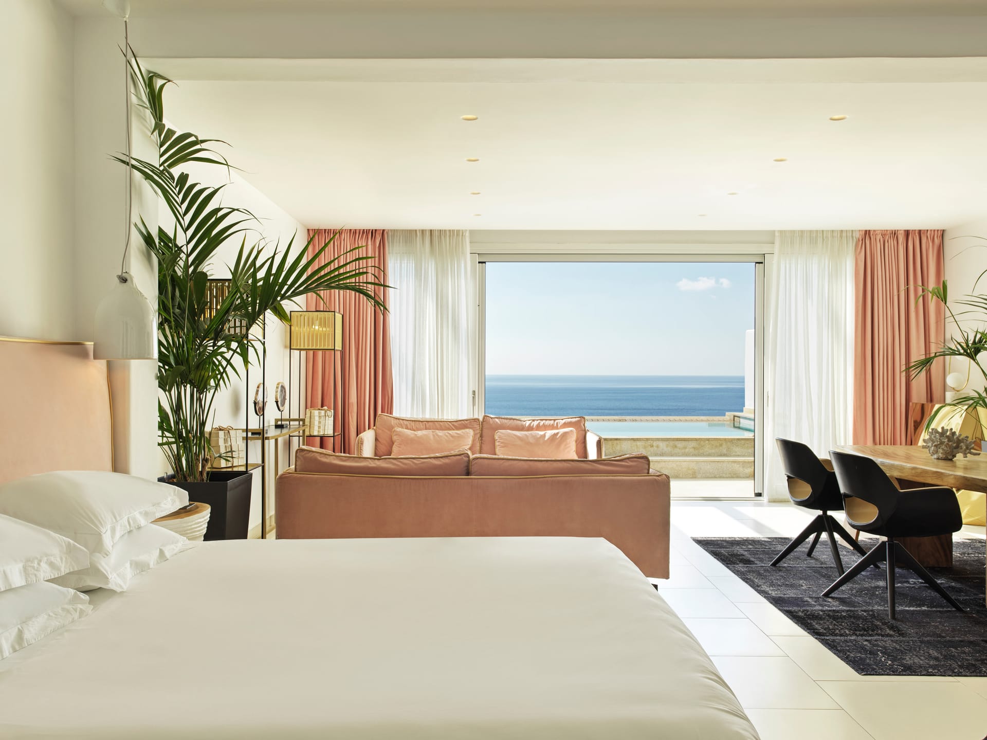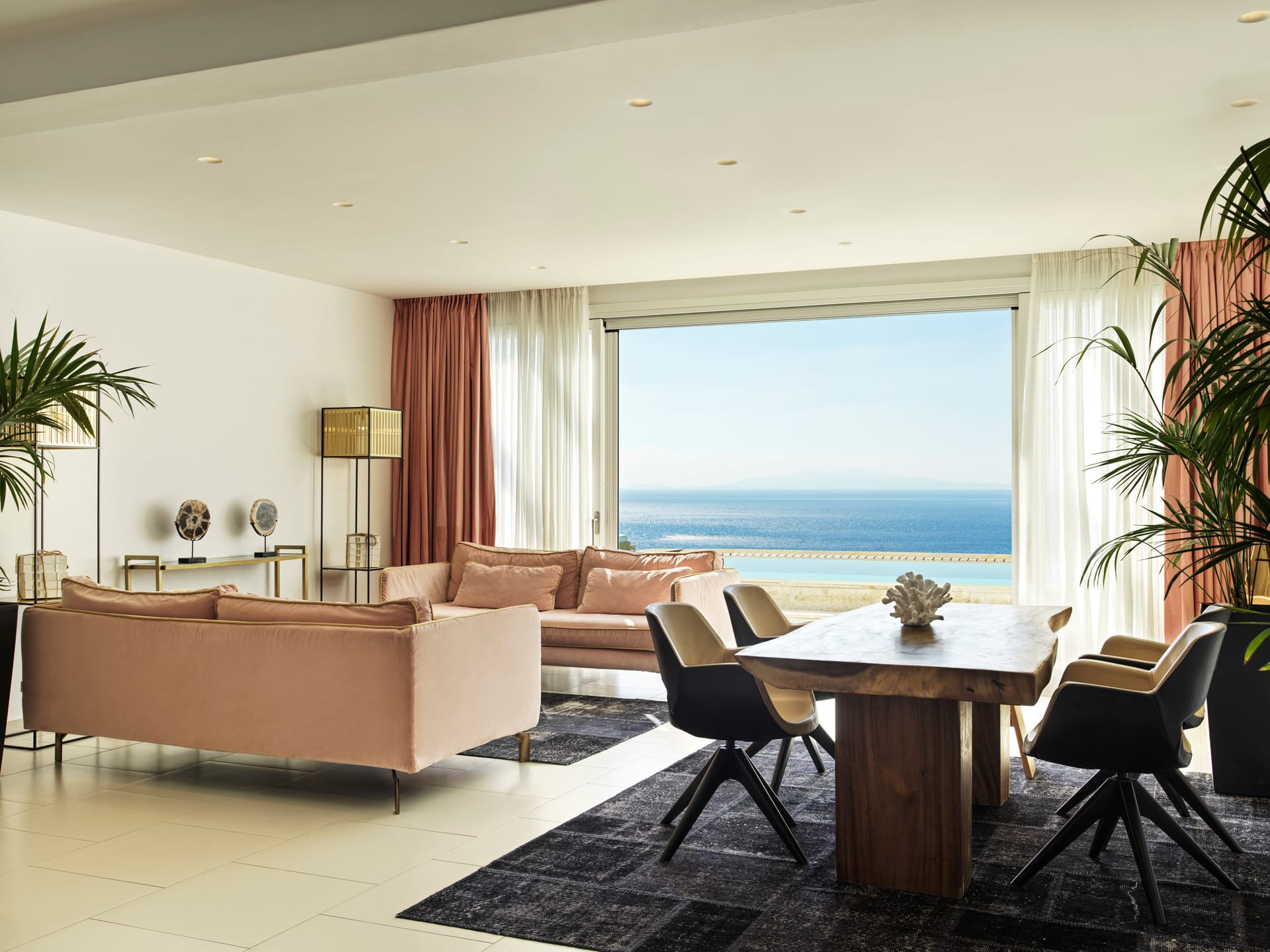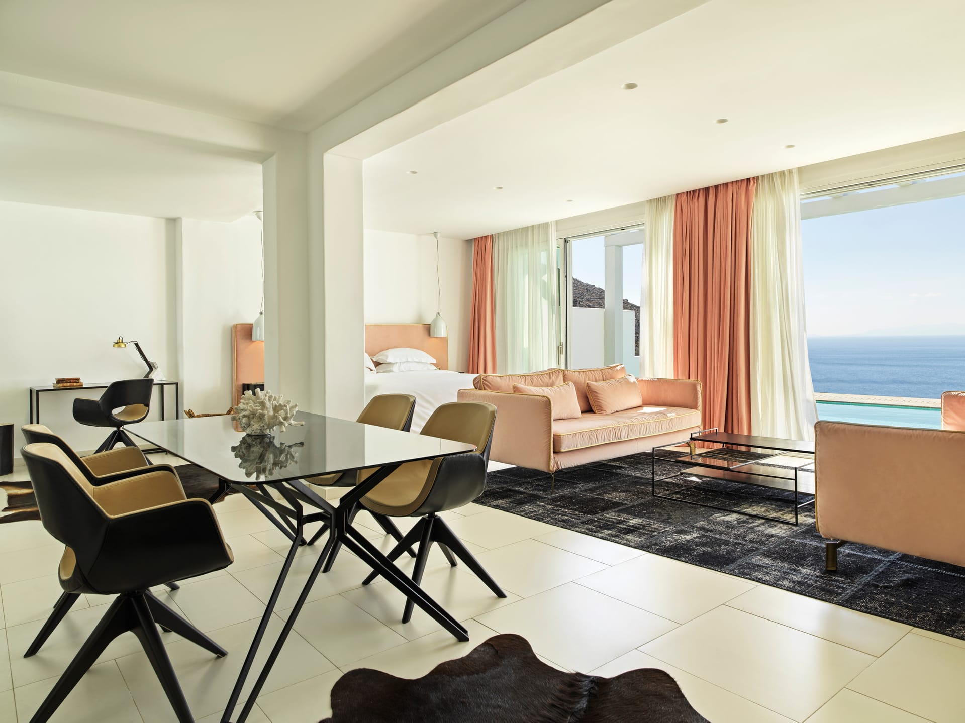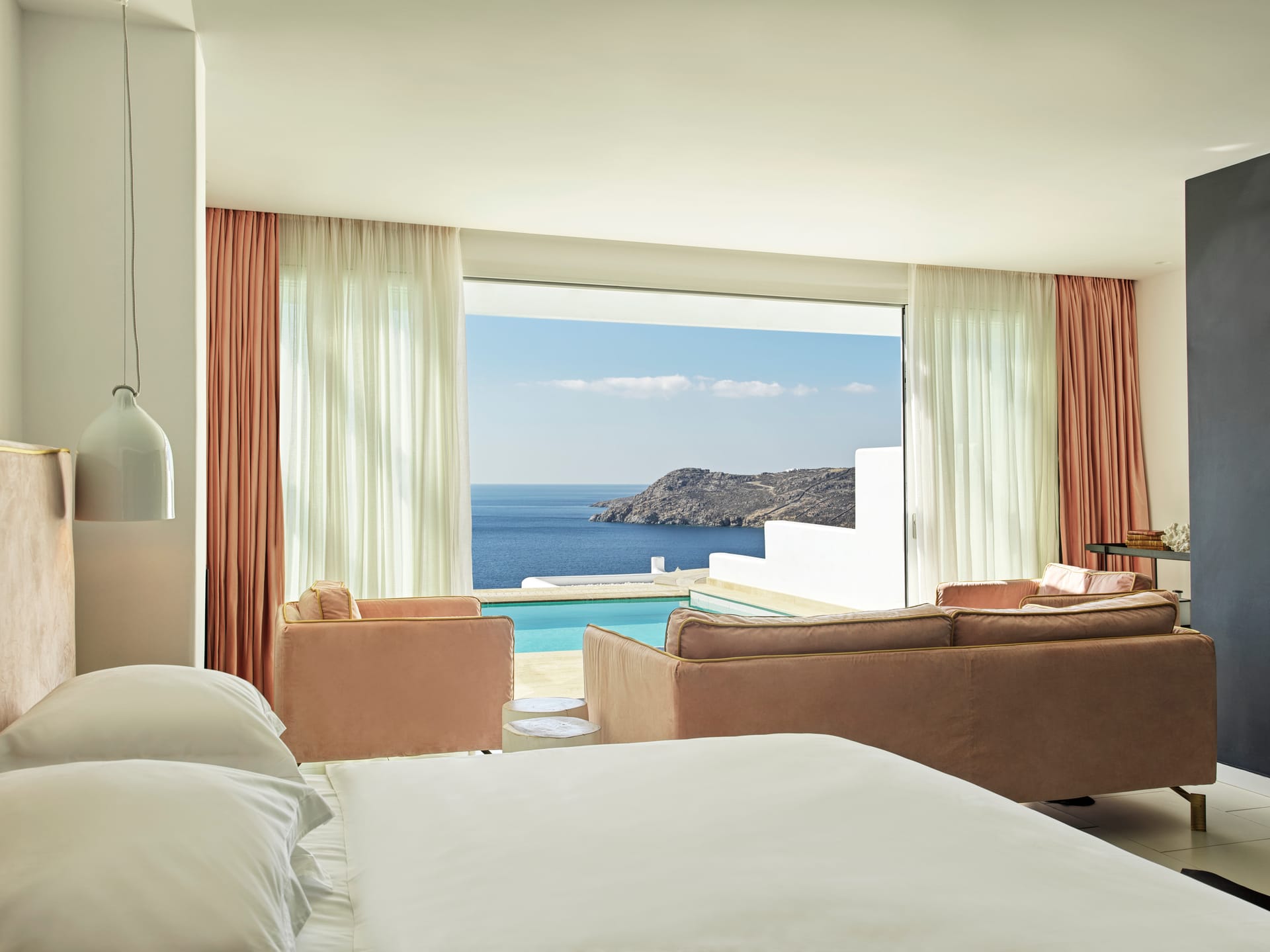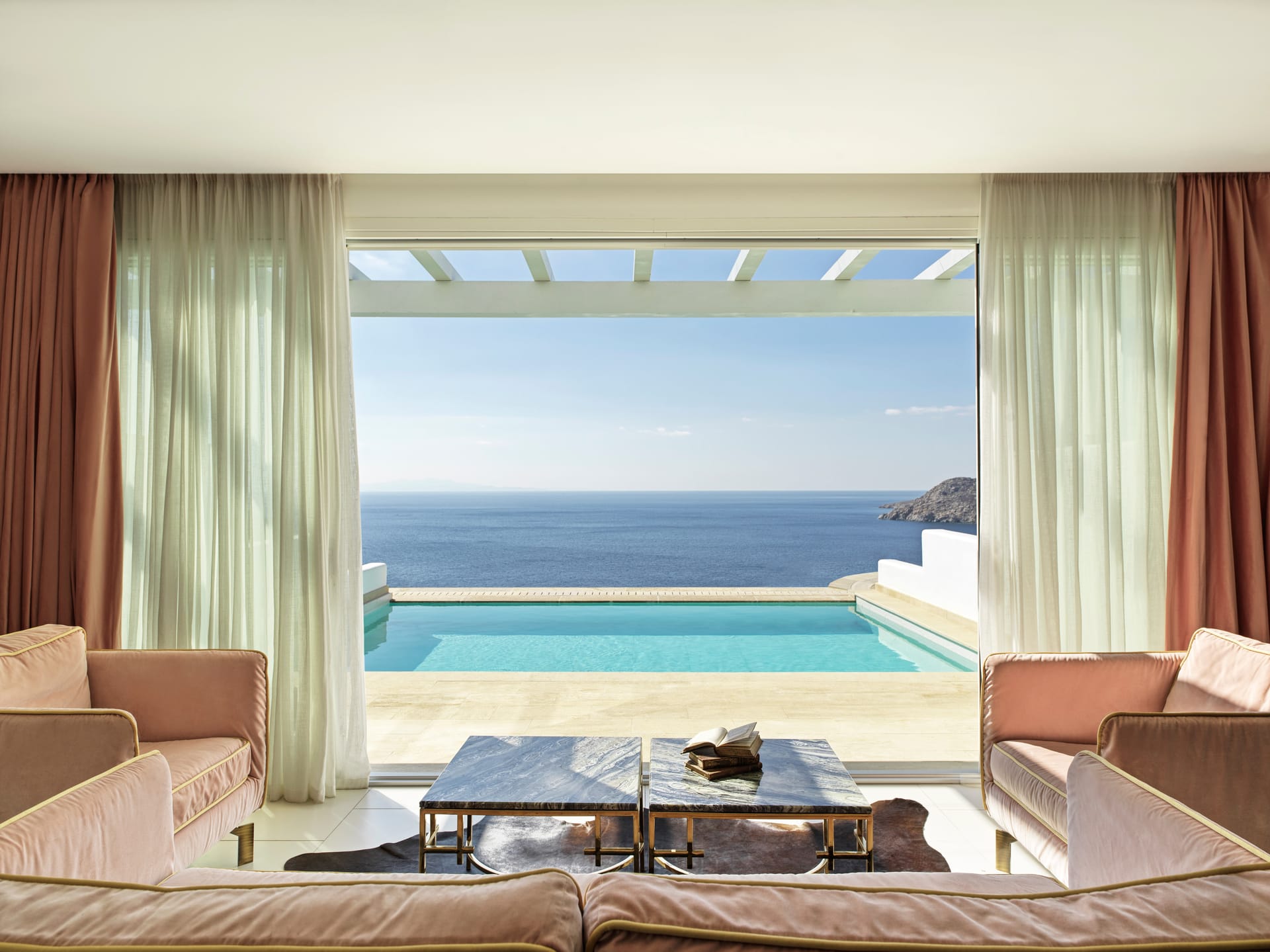 The Elegant in-house Villa Experience provides a combination of 1 or 2 master guestrooms to accommodate up to 5 guests in total comfort. Each in-house Villa provides a private sunbathing terrace with an infinity sea water pool overlooking the Aegean Sea for a truly remarkable living experience.